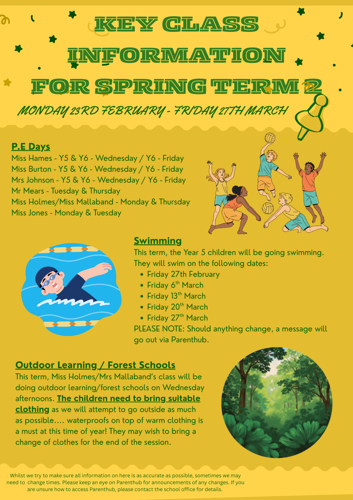 This term, Miss Holmes/Mrs Mallaband’s class will be doing outdoor learning/forest schools on Wednesday afternoons. The children need to bring suitable clothing as we will attempt to go outside as much as possible.... waterproofs on top of warm clothing is a must at this time of year! They may wish to bring a change of clothes for the end of the session.