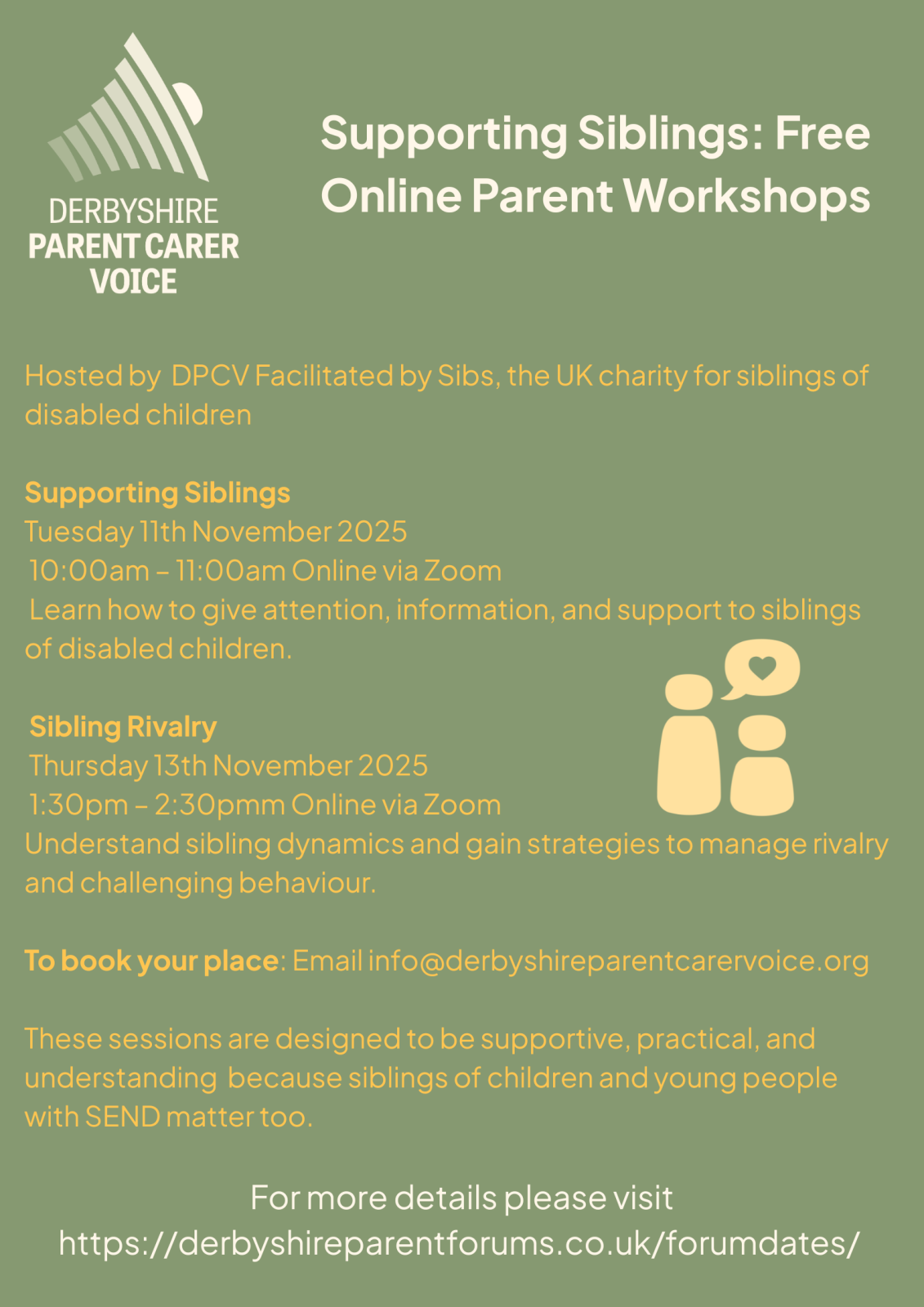 We represent Derbyshire parents and carers of children with SEN and Disability. We work in co-production with Derbyshire parents/carers and the Local Authority. Click on the image to enlarge.